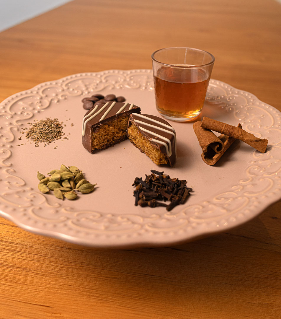 Nos pães de mel, utilizamos um mix de especiarias: além de cravo e canela, colocamos também cardamomo, erva-doce, noz moscada, entre outras. E, claro, chocolate de primeira (nada de chocolate fracionado ou hidrogenado!).